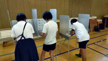 今回は、区役所の方に来ていただき、模擬選挙を体験しました。実際に使う投票箱や投票用紙を使って行いました。