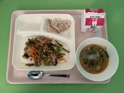 もずくと豚ひき肉のジューシー、さつまいものみそ汁、焼きれんこん、牛乳