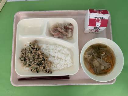 鶏肉のゆず塩焼き、ソーキ汁、ツナ大豆どぼろ、ごはん、牛乳