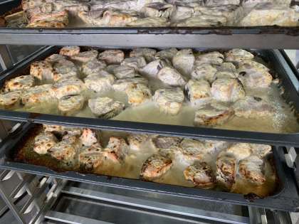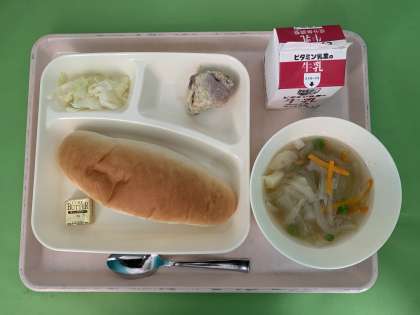 かつおのガーリックマリネ焼き[ノンエッグドレッシング]、ウィンナーとじゃがいものスープ、キャベツのサラダ、コッペパン、バター、牛乳