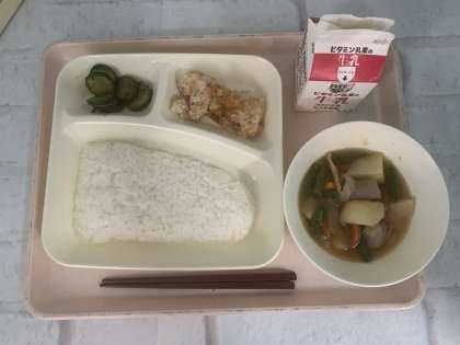 あげどりのねぎだれかけ、豚肉とじゃがいもの煮もの。きゅうりの赤じそあえ、ごはん、牛乳
