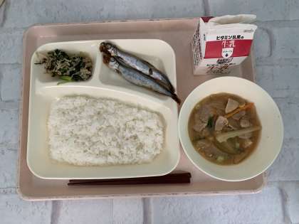 焼きししゃも、みそ汁、こまつなのいためもの、ごはん、牛乳