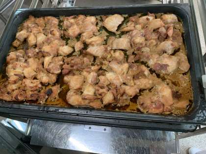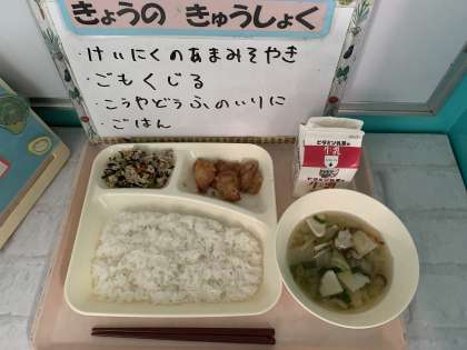 鶏肉の甘みそ焼き、五目汁、高野豆腐のいり煮、ごはん、牛乳