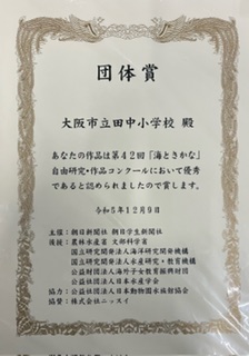 夏休みの課題で応募した「海とさかな」作品コンクールにおいて、学校表彰を受けました。