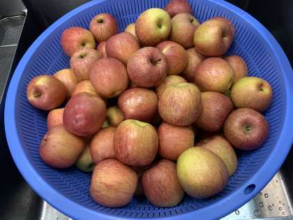 豚肉と野菜のスープ煮、カレーソテー、りんご、黒糖パン、牛乳