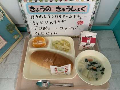ほうれんそうのクリームシチュー、キャベツのサラダ、デコポン、コッペパン、りんごジャム、牛乳