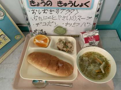 押麦のグラタン、豚肉と野菜のスープ、デコポン、おさつパン、牛乳