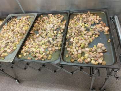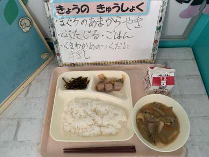 まぐろの甘辛焼き、豚汁、くきわかめのつくだ煮、ごはん、牛乳