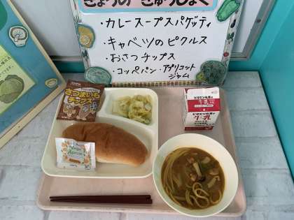 カレースープスパゲッティ、キャベツのピクルス、おさつチップス、コッペパン、アプリコットジャム、牛乳