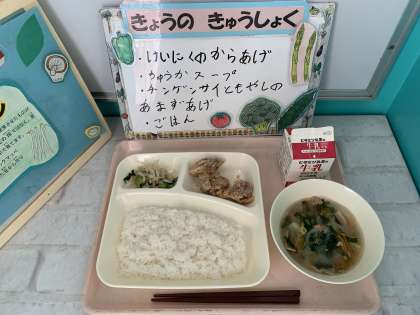 鶏肉のからあげ、中華スープ、チンゲンサイともやしの甘酢あえ、ごはん、牛乳