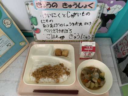 鶏肉とじゃがいもの煮もの、あつあげのしょうゆだれかけ、紅さけそぼろ、ごはん、牛乳