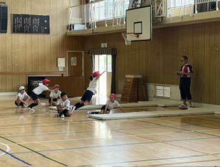 体育館にて、スポーツテスト項目の立ち幅跳びを行っています