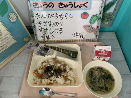 きんぴらちらし、きざみのり、すまし汁、ちまき、牛乳