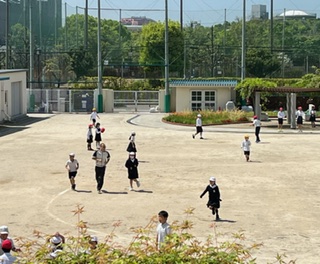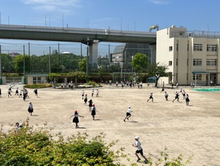 とてもよく晴れた日で、運動場で気持ちよく活動できています