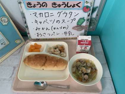 マカロニグラタン、キャベツのスープ、みかん(缶)、おさつパン、牛乳