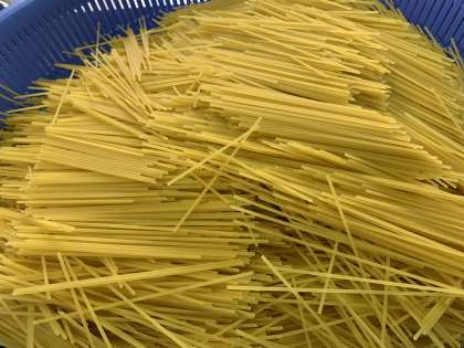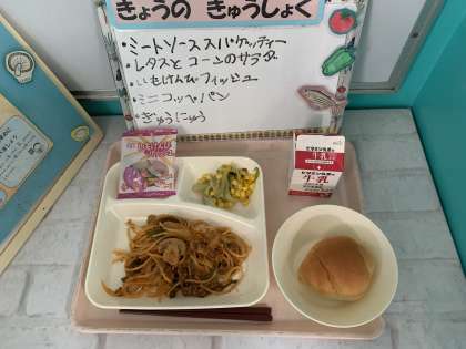 ミートソーススパゲッティ、レタスとコーンのサラダ、いもけんぴフィッシュ、ミニコッペパン、牛乳