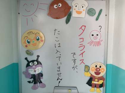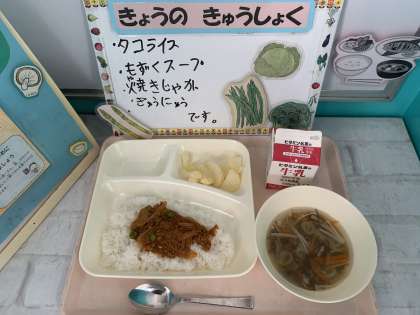 タコライス、もずくのスープ、焼きじゃが、牛乳
