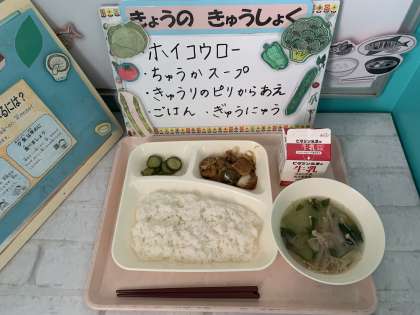 ホイコウロー、中華スープ、きゅうりのピリ辛、ごはん、牛乳