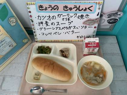 かつおのガーリックマリネ焼き、押麦のスープ、グリーンアスパラガスのソテー、コッペパン、バター、牛乳
