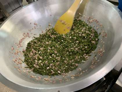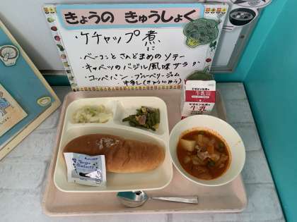 ケチャップ煮、ベーコンとさんどまめのソテー、キャベツのバジル風味サラダ、コッペパン、ブルーベリージャム、牛乳