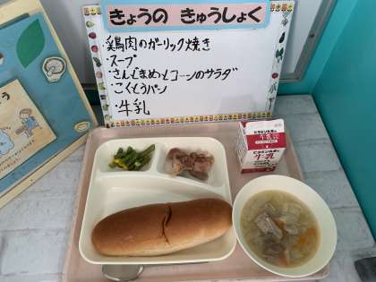 鶏肉のガーリック焼き、スープ、さんどまめとコーンのサラダ、黒糖パン、牛乳