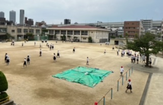運動場で遊ぶ児童が多くいました