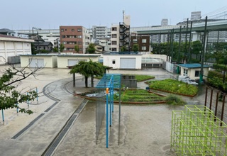 運動場に水たまりがたくさんあります