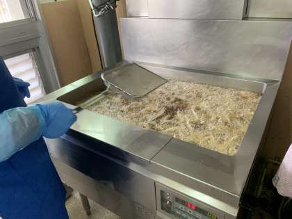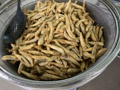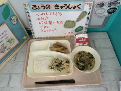 いわしてんぷら、五目汁、とりなっ葉いため、ごはん、牛乳