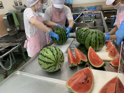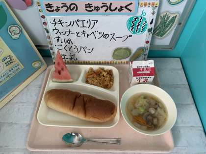 チキンパエリア、ウィンナーとキャベツのスープ、すいか、黒糖パン、牛乳