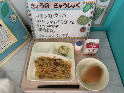 チキントマトスパゲッティ、グリーンアスパラガスとキャベツのサラダ、発酵乳、ミニコッペパン、牛乳