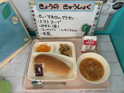 カレーマカロニグラタン、トマトスープ、みかん(缶)