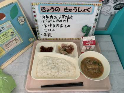 豚肉の甘辛焼き、とうがんのみそ汁、金時豆の煮もの、ごはん、牛乳