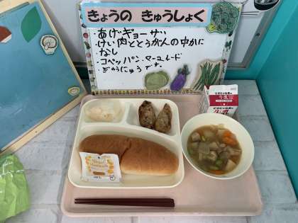 揚げギョーザ、鶏肉ととうがんの中華煮、なし(豊水)、コッペパン、ママレード、牛乳