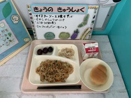 オイスターソース焼きそぼ、もやしのしょうがづけ、ぶどう(巨峰)、ミニコッペパン、牛乳