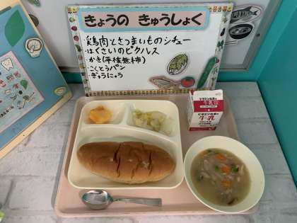 鶏肉とさつまいものシチュー、はくさいのピクルス、かき(平種無柿)、黒糖パン、牛乳