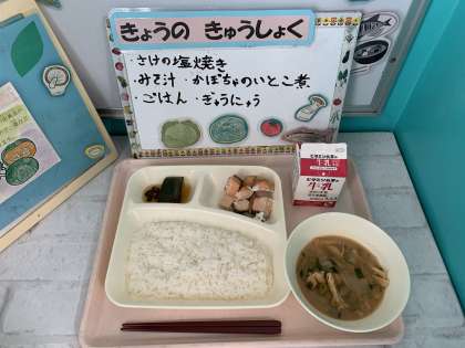 さけの塩焼き、みそ汁、かぼちゃのいとこ煮、ごはん、牛乳