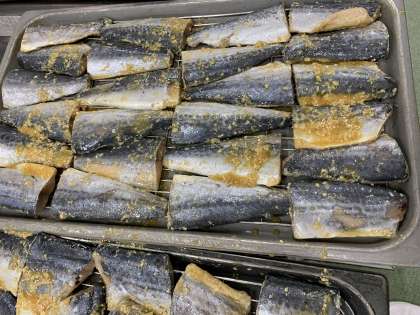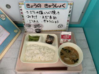 さごしの塩こうじ焼き、みそ汁、えだまめ、ごはん、牛乳
