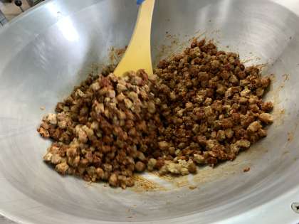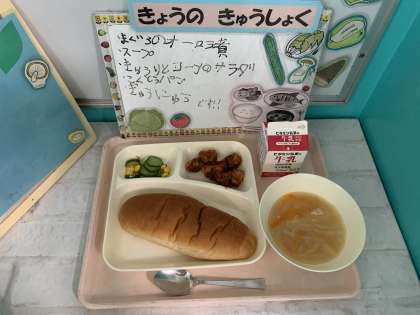 まぐろのオーロラ煮、スープ、きゅうりとコーンのサラダ、黒糖パン、牛乳
