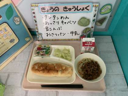 タンタンめん、あっさりキャベツ、豆こんぶ、おさつパン、牛乳