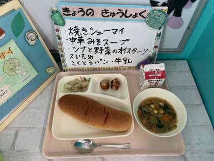 焼きシューマイ、中華ミソスープ、ツナと野菜のオイスターソースいため、黒糖パン、牛乳