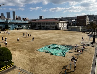 運動場で元気に遊ぶ児童の姿が多く見られます
