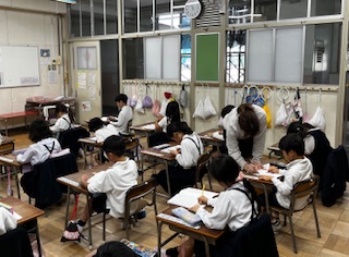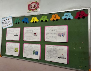 ※教室前の廊下には、国語の時間で作成した「のりものずかん」が掲示されていました