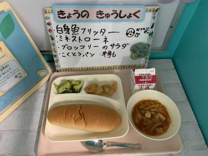 白身魚のフリッター、ミネストローネ、ブロッコリーのサラダ、黒糖パン、牛乳