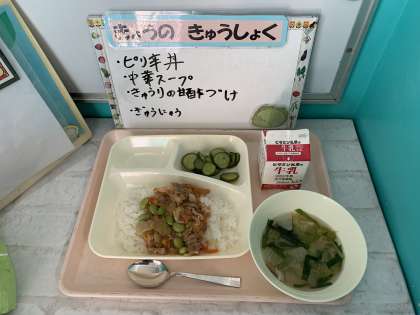 ピリ辛丼、中華スープ、きゅうりの甘酢づけ、牛乳