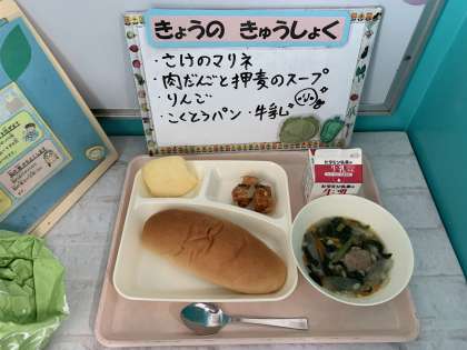 さけのマリネ、肉だんごと押麦のスープ、りんご、黒糖パン、牛乳