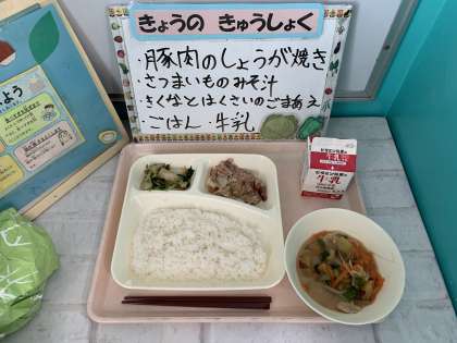 豚肉のしょうが焼き、さつまいものみそ汁、きくなとはくさいのごまあえ、ごはん、牛乳