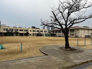 校舎の外壁塗装のために覆われていたところが一部撤去されています