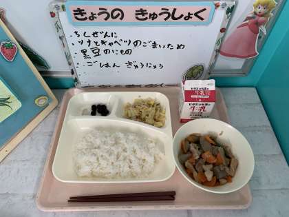 筑前煮、ツナとキャベツのごまいため、黒豆の煮もの、ごはん、牛乳
