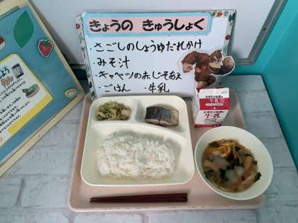 さごしのしょうゆだれかけ、みそ汁、キャベツの赤じそあえ、ごはん、牛乳