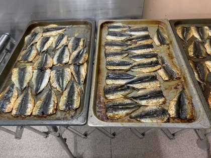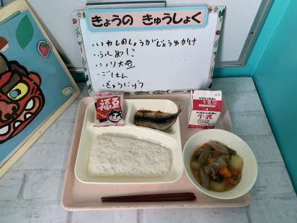 給食では、節分の行事献立として「いわしのしょうがじょうゆかけ」と「いり大豆」が出ます。